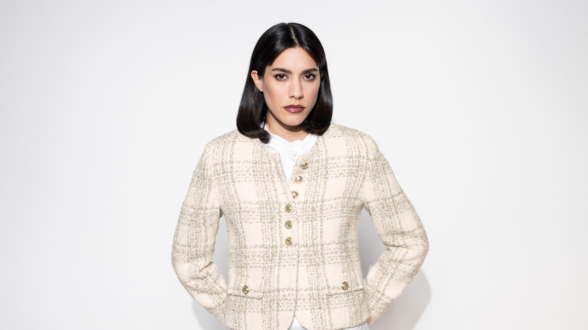 Karierte Kastenjacke aus Bouclé für Damen in zarten Farben und feinem Glanzgarn von White Label Premium. Karierte Kastenjacke aus Bouclé für Damen in zarten Farben und feinem Glanzgarn von White Label Premium – Vorderansicht